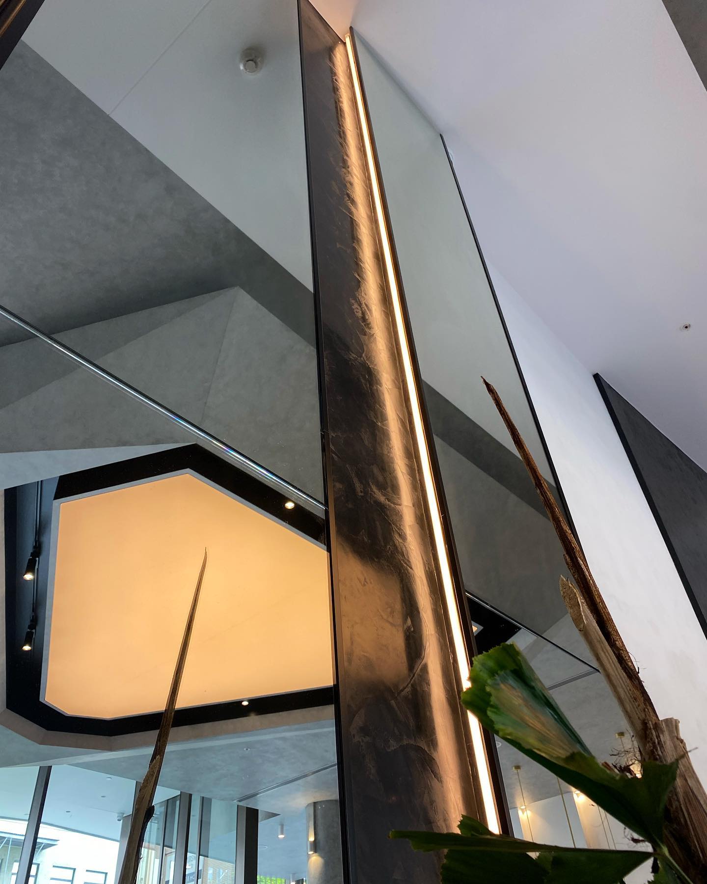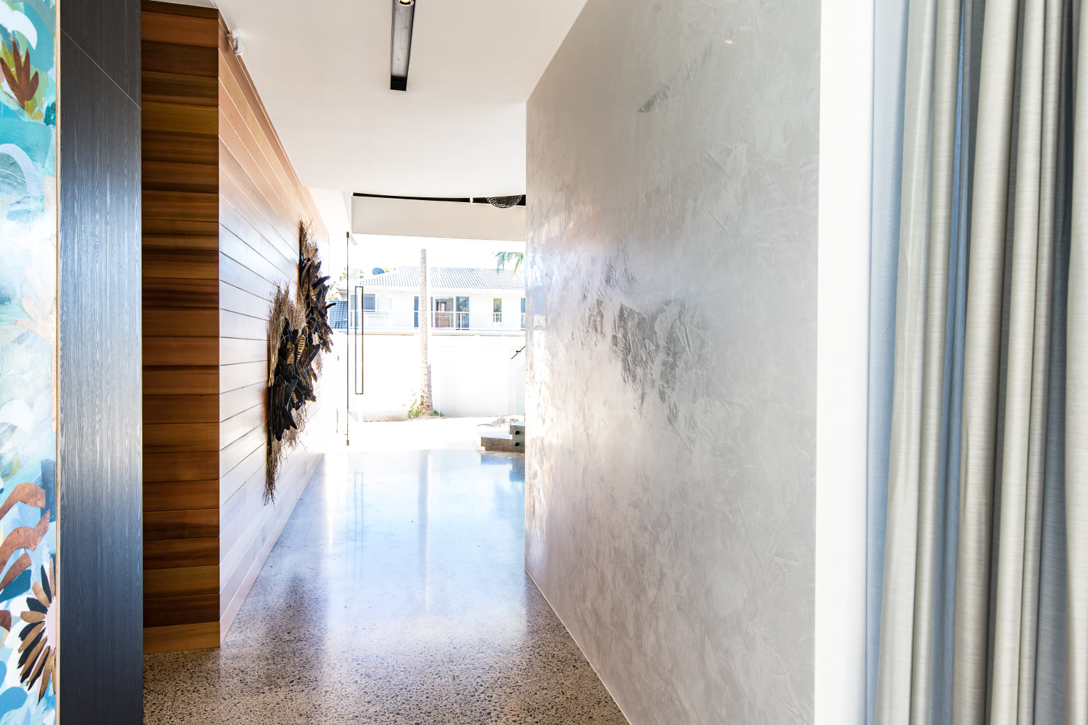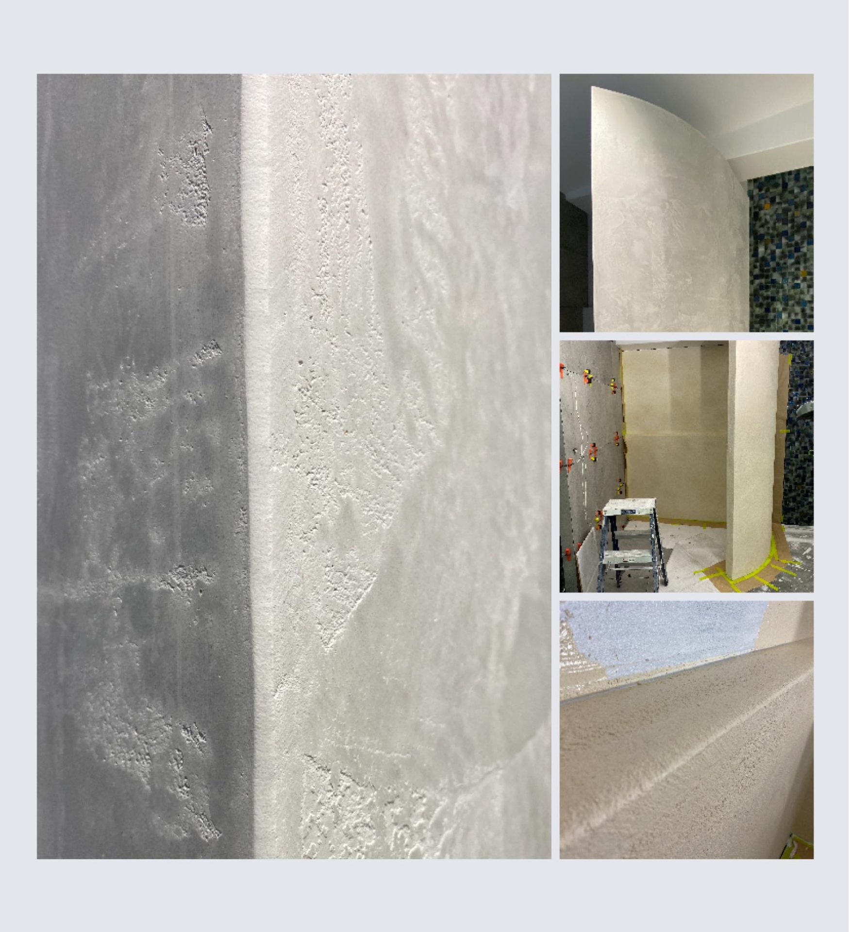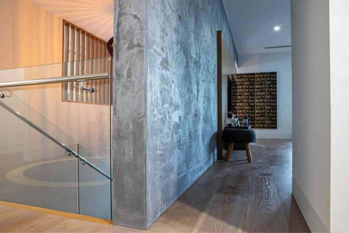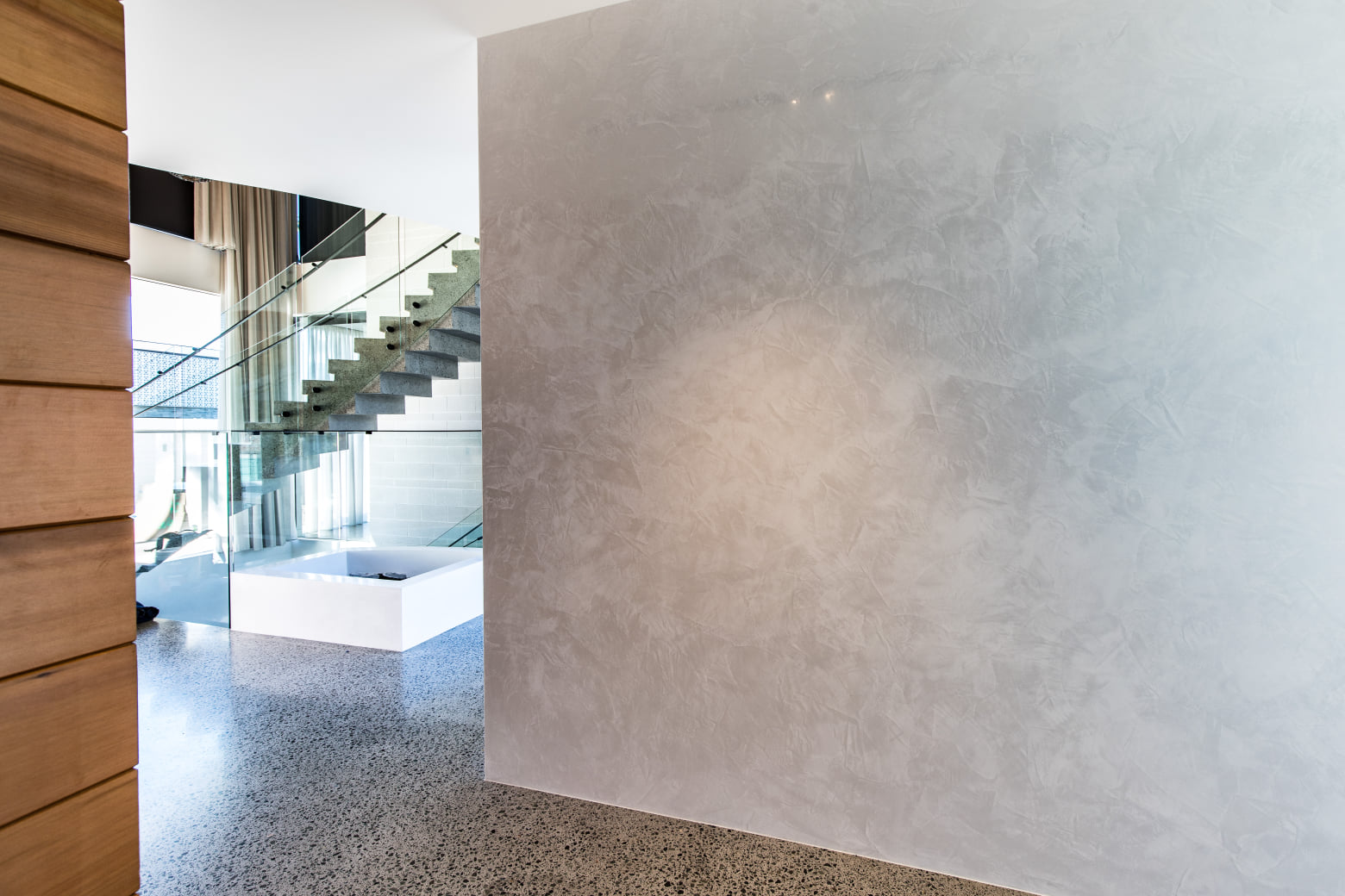 Tadelakt feature wall in dark grey, rough finish with water based polyurethane sealer.